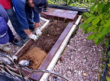 Далее приступаем к установке подставки памятника. После того, как она была возвращена на своё место, размечаем цветник. Параллельно работаем с периметром могилы: по краю пускаем металлическую планку, которая послужит границей брусчатки.